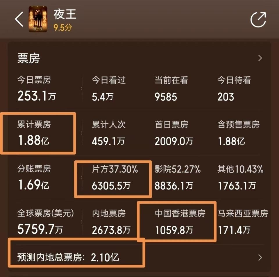 如果《夜王》最终全球票房冲上 3 亿人民币,按照分账比例,片方收入会超过 1 亿,加上东南亚版权收益,以及下映之后,卖给流媒体平台的收入,最终《夜王》的收益约在 1.5 亿左右。