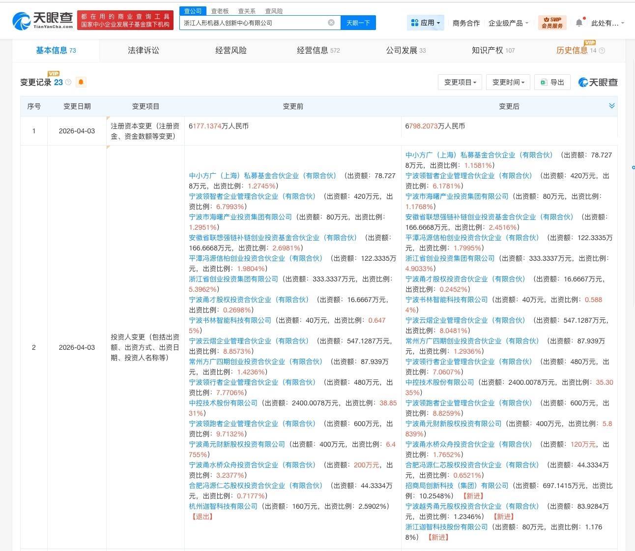 南方财经4月8日电,天眼查App显示,近日,浙江人形机器人创新中心有限公司发生工商变更,新增招商局创新科技(集团)有限公司、宁波越秀甬元股权投资合伙企业(有限合伙)为股东,同时,注册资本由约6177万人民币增至约6798万人民币。浙江人形机器人创新中心有限公司成立于2023年12月,法定代表人为熊蓉,经营范围包括智能机器人的研发、智能机器人销售、智能控制系统集成等,由中控技术(688777)、浙江省创业投资集团有限公司及上述新增股东等共同持股。